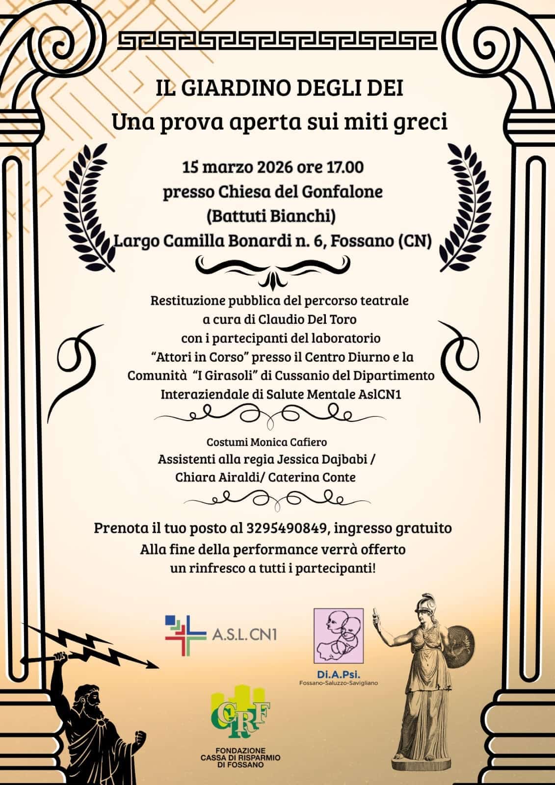 Domenica 15 marzo 2026 alle ore 17.00, presso la Chiesa del Gonfalone (Battuti Bianchi) di Fossano, si terrà “Il Giardino degli Dei”, prova aperta dedicata ai miti greci.
