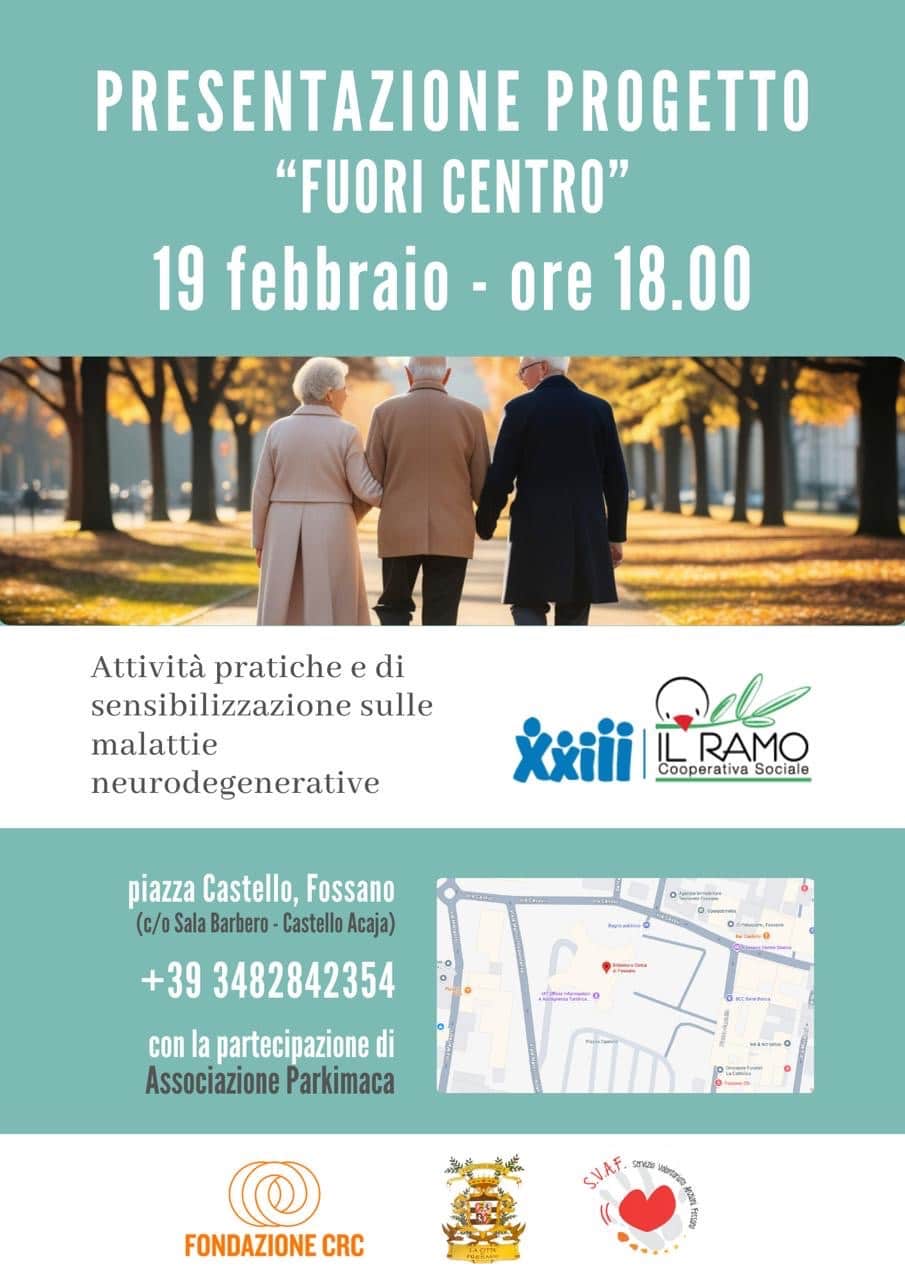 Giovedì 19 febbraio alle ore 18.00, presso la Sala Barbero del Castello degli Acaja di Fossano, sarà presentato il progetto “Fuori Centro”, un’iniziativa dedicata alla sensibilizzazione, al supporto e alla condivisione di esperienze legate alle malattie neurodegenerative.